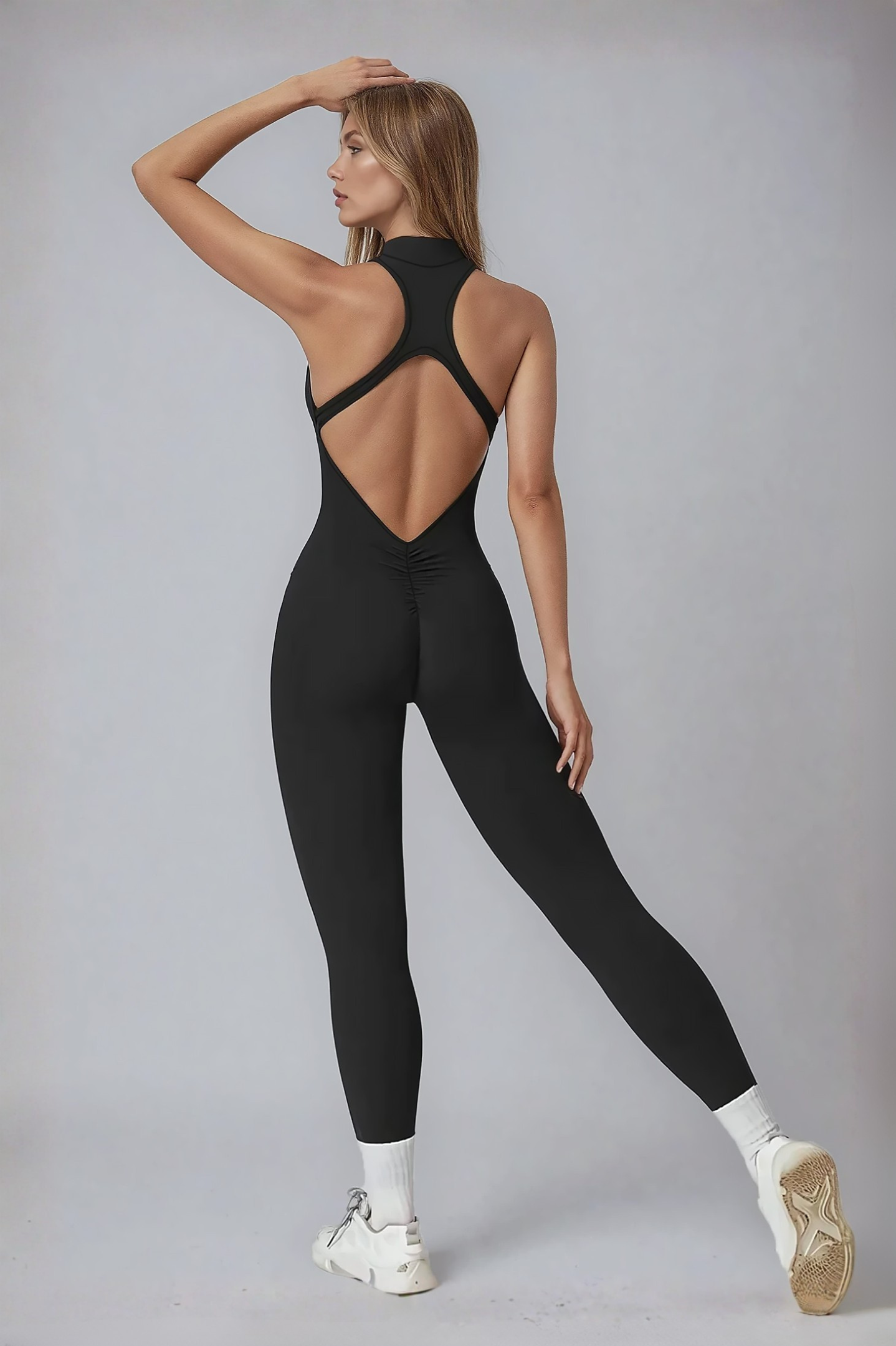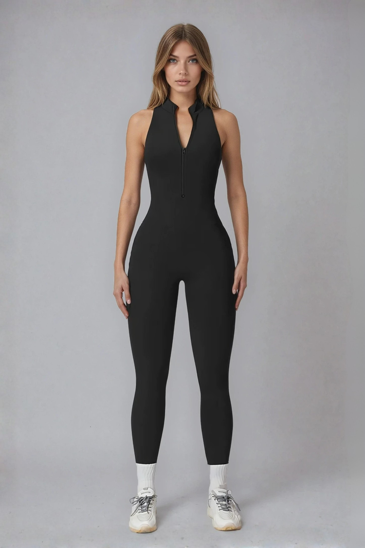 Meet the Elena Backless Jumpsuit—where sleek design meets all-day comfort. With a sophisticated high-neck zip front and subtle ruched back detailing, it’s made to flatter your shape while keeping you supported through every move. Crafted from soft, sculpting fabric that stretches and breathes, it’s perfect for everything from high-intensity sessions to off-duty days. This one-piece wonder is your go-to for feeling confident, polished, and effortlessly put together.